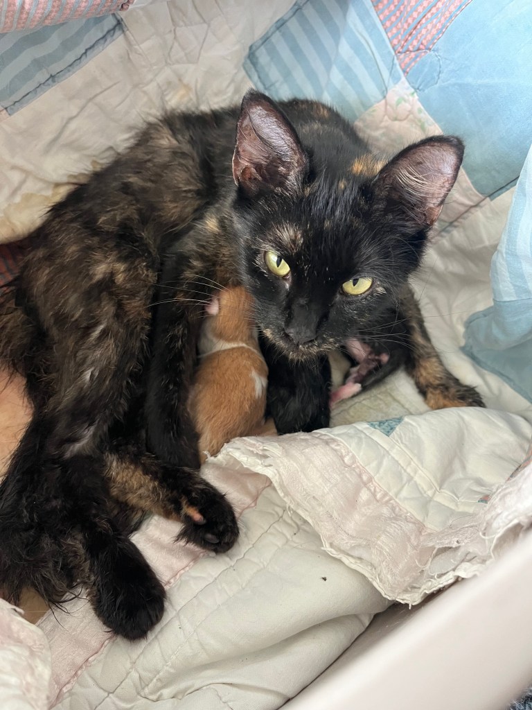 MAVIS was a kitten who was left outside. The folks in the neighborhood noticed she was acting strange. They put in a box where she gave birth to 3 babies within the hours. We are happy to say she now lives in Orlando with her foster family &